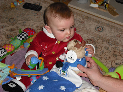 Despite his lack of Christmas awareness, DC was nonethless showered with gifts and utterly spoilt, even though I had said we shouldn't really buy him much. Clearly, I failed to listen to my own advice and went out and bought cuddly toys, clothes and other bits and bobs as I couldn't let his first Christmas go by without the excuse to spend money. Granny, Grandma & Grandad, aunties, uncles, cousins and friends were all on board with the 'Let's spoil DC for his first Christmas' roadshow and bought him three bath toys, clothes, books, cuddly toys, a snow globe, a Wigan Athletic Christmas stocking, a shape sorter, and umpteen other lovely things. Luckily, hubby listened to me (for a change?) and spent no more than the £10 limit I had suggested; this involved buying DC an iconic "I 'heart' NY" vest and then making a noisey tube out of an old breadstick container filled with seeds. Guess which pressie DC liked best out of all those we bought him? Yep, hubby's homemade contraption. Which just goes to show that Kirstie was right about homemade Christmas presents being the best...